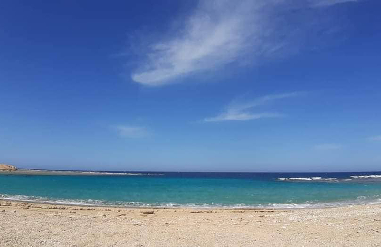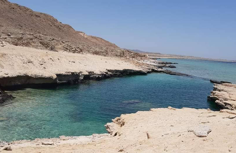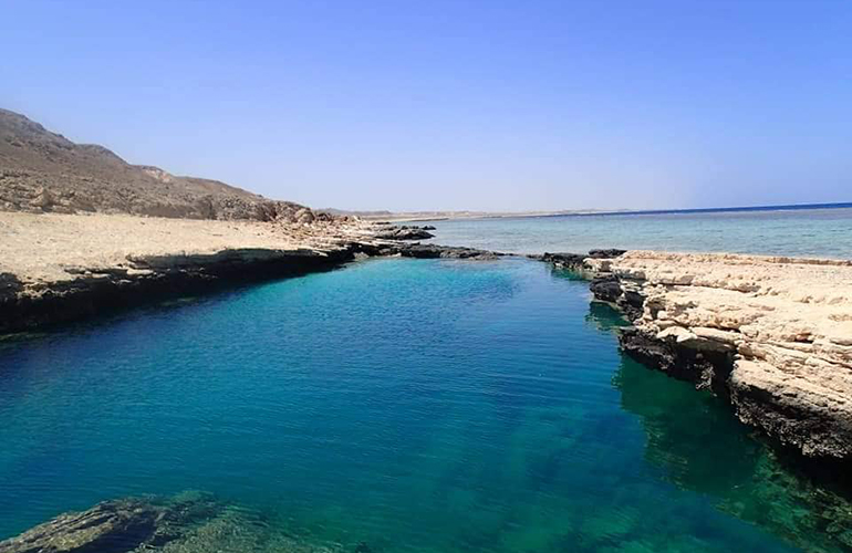 The approach to the Nayzak is an unremarkable off-road, it is located 8 km south Marsa Alam. It got its name by the area inhabitants who believe it has been shaped by a meteorite, hitting the coast. Nayzak is known for its pool, several meters in diameter, shaped like an eye, filled with the turquoise blue waters of the Red Sea. Complete your afternoon with us with a delicious barbecue in a little cave overlooking the pool, while the sun sets over the hills and shining in the water.